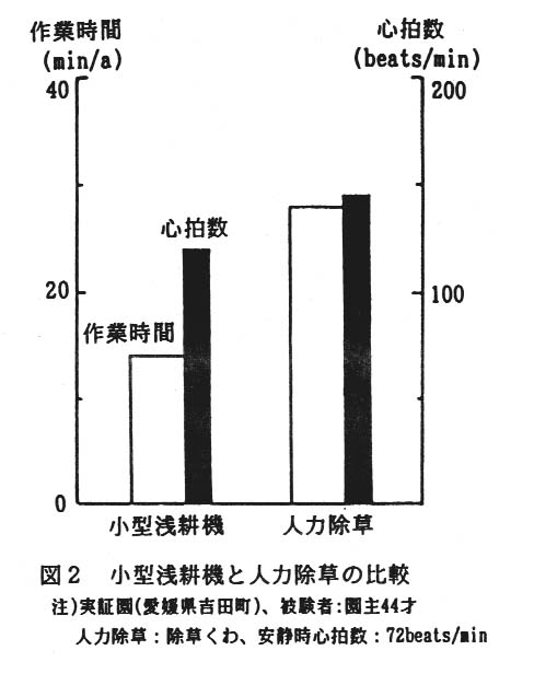 小型浅耕機による中耕除草作業は、除草くわによる人力作業と比べて作業時間が約50%に短縮するとともに、作業時の心拍数も減少し、労働負担も軽減される(