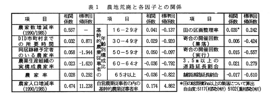 発生は、農家数増減率、農家人口増減率、自営農業従事者の内の基幹的農業従事者率の影響が強い。また、田の区画整備率は農地荒廃の抑止要因である。