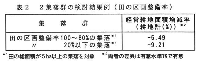 「経営耕地面積増減率(耕地計)」に対して、「田の区画整備率」が高い集落群と低い集落群の間に約4%の差があることから、「田の区画整備率」は農地荒廃の抑止要因である(