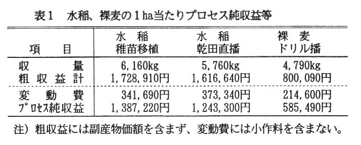 で求めると、水稲7.7ha、裸麦8.9haとなるが、水稲の稚苗移植栽培と