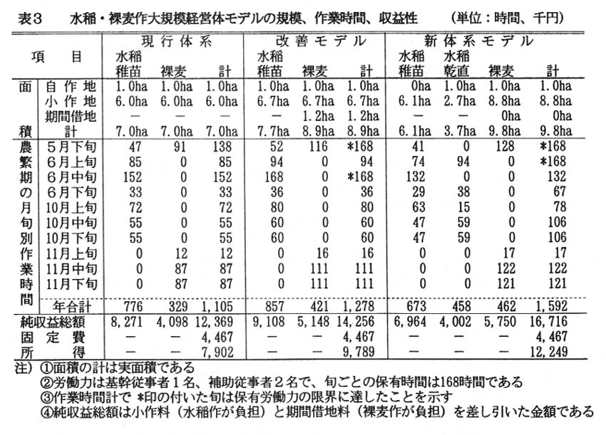 そこで、平成6~8年度に愛媛県伊予郡松前町で実施した現地実証試験の成果を踏まえて、現行の水稲稚苗移植栽培+裸麦作体系に、水稲の乾田直播栽培を導入した大規模稲・麦作の個別経営体モデルを線形計画法を用いて作成した。