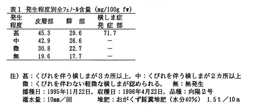 ニンジンの皮層部、飾部ともに、横しま症の発生程度が高いほど全フェノール含量が高く、特に横しま症発症部(はちまき状にくびれた部分)においてフェノール物質の蓄積が認められる。(