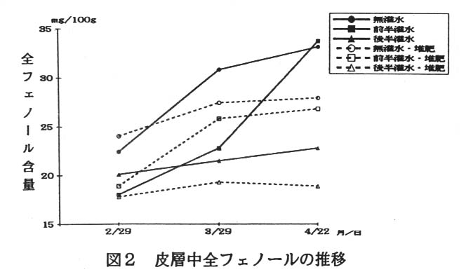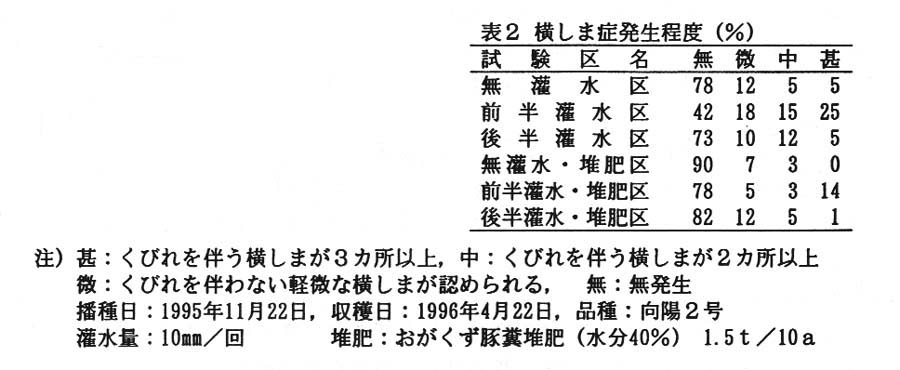 当時、横しま症の発生し易い品種はフェノール物質を多く含有し、黒しみ症も発生し易いことが確認されたが、本試験では、土壌の水管理および堆肥の施用がニンジン表皮へのフェノール物質の蓄積と横しま症発生に及ぼす影響を検討した。