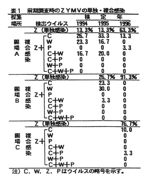 発病初期では特にZYMVが被書をもたらしていることが示唆されたが、具休的な防除対策については今後の課題となる。