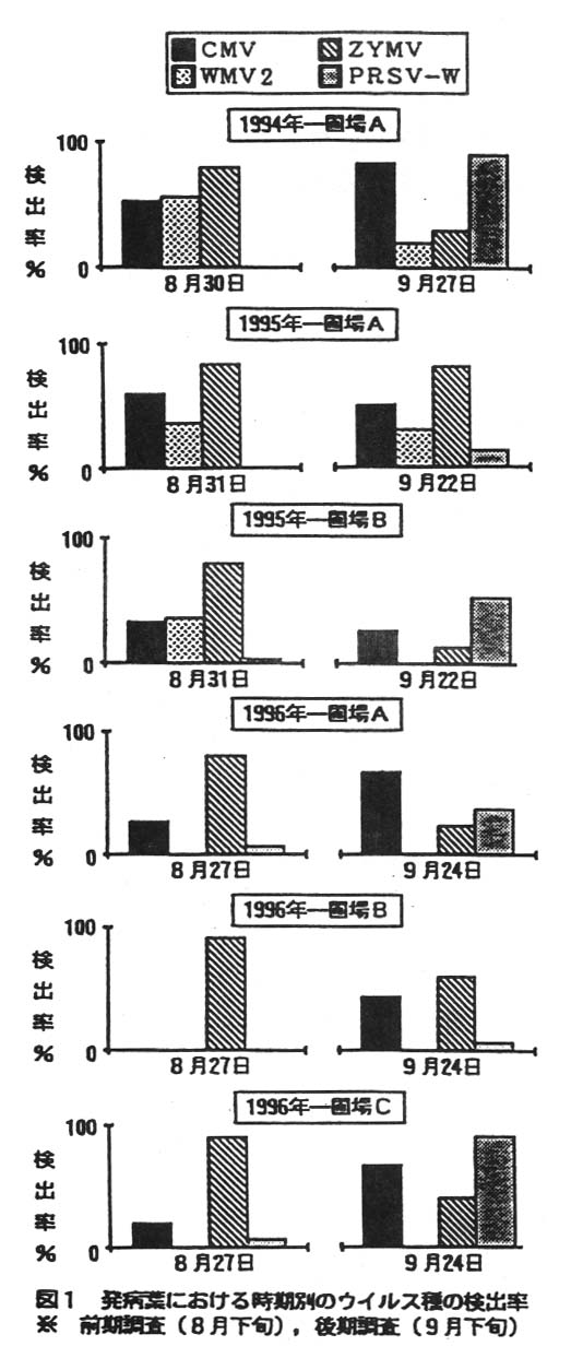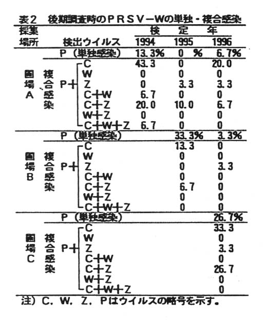 PRSV-Wは前期調査では最大6.7%しかなく殆ど検出されないが、後期調査時に多くなる傾向がみられる(