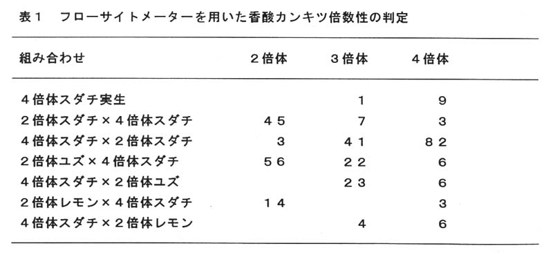 4倍体スダチと2倍体の香酸カンキツとの交配により得られた実生321個体を供試したところ、98個体の3倍体交雑実生を得ることができた(