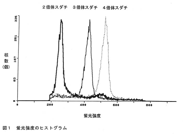 、 50mM Tris-HCI(pH7.5)を含むbufferを用いて得られた粗抽出液をPropidium Iodideで染色し,フローサイトメーターで蛍光強度を測定することにより、2、3、4倍体個有の安定したピークを得ることができる(