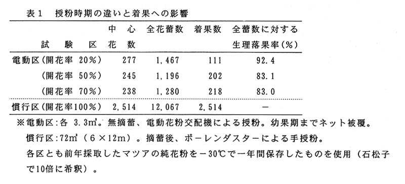 電動花粉交配機は、使用する花粉の希釈倍率や増量剤等の検討が必要である。また、果実の大きさ、品質についても更に検討する必要がある。