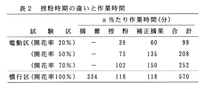 AMー203は、糖度が高く食味良好で、個性的な外観(45g程度の小玉、無毛)を持つ新しい果実であるが、側花の着生が非常に多く、摘蕾摘果作業を省カ化する必要がある。そこで、摘蕾作業を省き、電動花粉交配機(M社製:NH-2)を用いて省力的な着果調整法について、授粉時期と作業時間を検討する。