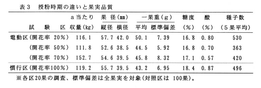 中心花の開花率が20%の時期に、摘蕾を行わずに電動花粉交配機で授粉すると、生理落果により、摘果作業が省力化される(