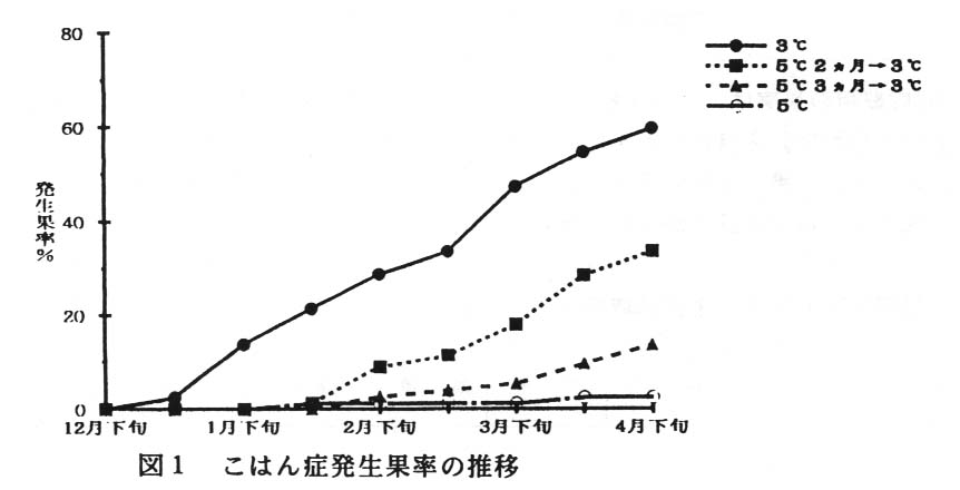 こはん症は、5℃よりも3℃の貯蔵条件で早くから、より多く発生することから、低温障害と考えられる(