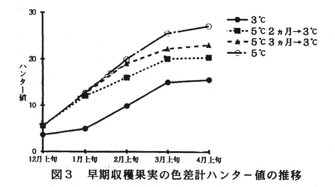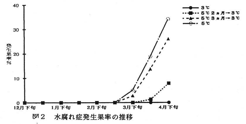)。したがって、貯蔵期間の前半をやや高めの5℃で貯蔵し、後半になって3℃と低めに変温管理すれば、全体的に障害果の発生を抑えることができる。
