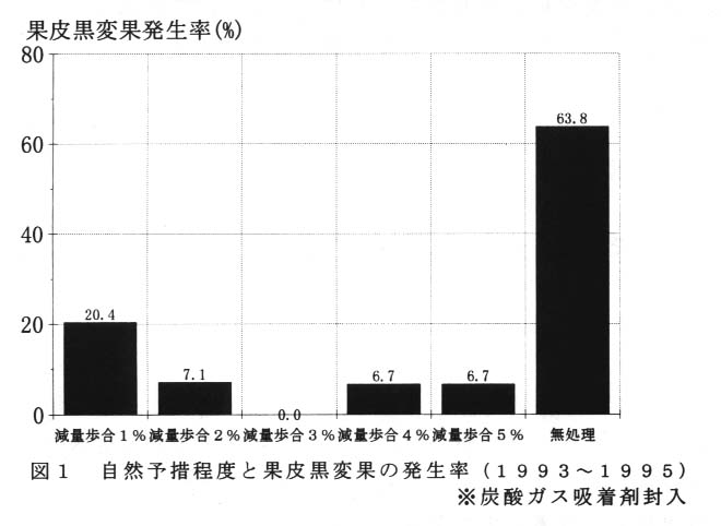 果実を収穫後に暗所で放置し、果実の重さを減量させる白然予措を行えば果皮黒変果の発生は抑制され、減量歩合3%(1週間程度)でその効果が最も高い(