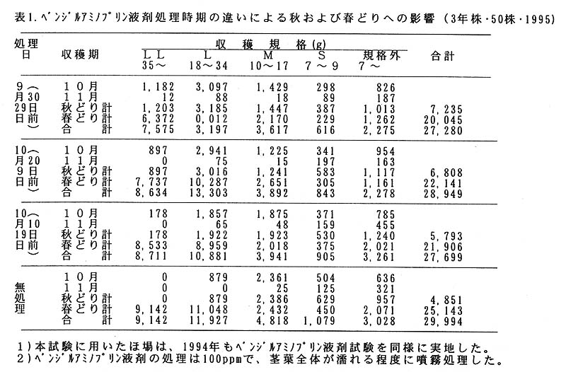 しかしベンジルアミノプリン液剤処理は、いずれの処理時期においても、翌年の春どり収量は減少する。