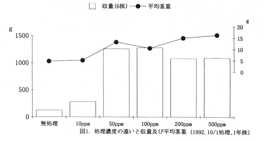 ベンジルアミノプリン液剤の処理濃度は、50ppmと100ppmで収量が高く平均茎重も重い。しかし、濃度の高い200ppmや500ppmでは、奇形などの異常茎が多くなる。また、逆に10ppmの低い濃度では萌芽数が少なく、増収には結びつかない。(
