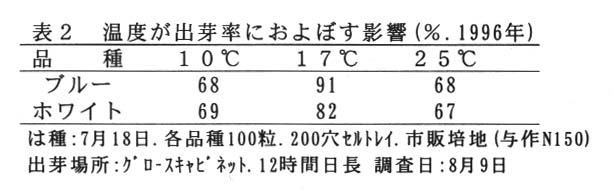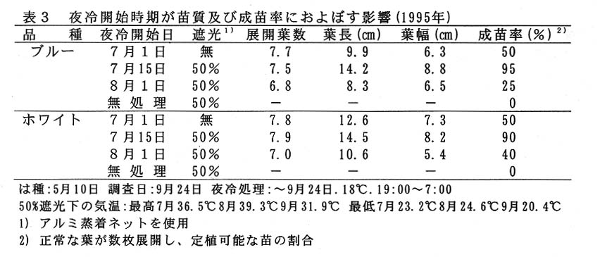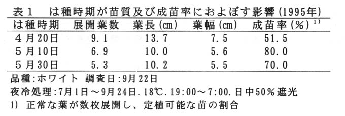 ・モナリザの実生促成栽培では、苗の養成期間が高温期と重なるため、平坦地での自家育苗は困難とされ、購入苗を利用する生産者にとっては、種苗費が大きな負担となっている。従って、低コスト生産を計るために、自家育苗技術の確立が必要になる。ここでは、安定的な苗生産を行うために、夜冷育苗技術について検討する。
