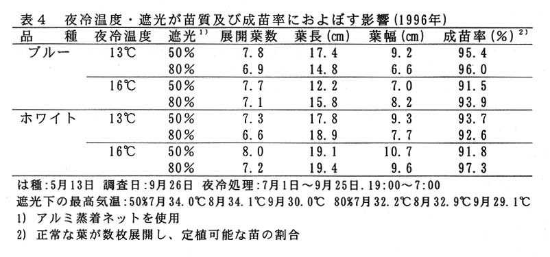 発芽後、育苗期間を通して遮光を行う。遮光率は50%程度がよい(