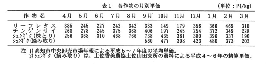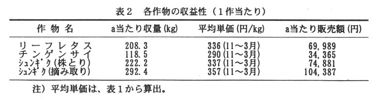 夏秋野菜の後作として、1a当たりリーフレタスは70千円、チンゲンサイは2作で69千円、シュンギクの株どり栽培は2作で150千円、シュンギクの摘み取り栽培は104千円の粗収益か期待できる(