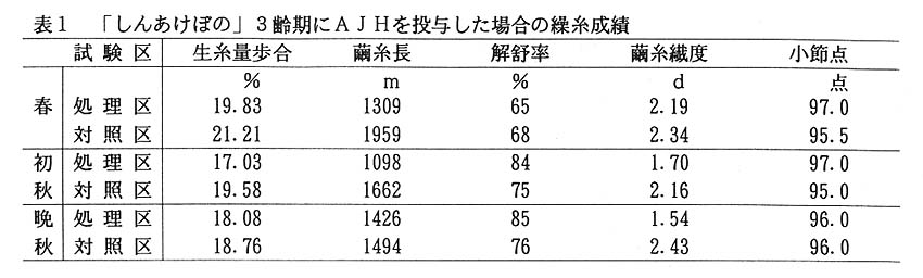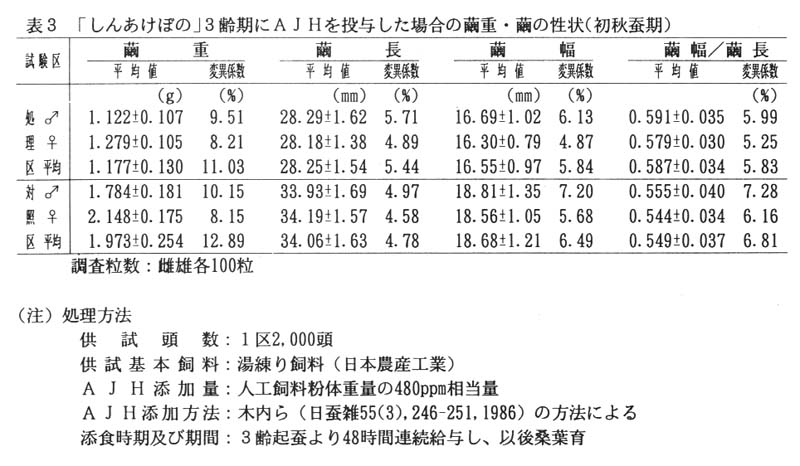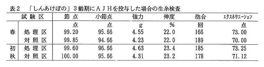 飼料粉体1gに対し、抗幼若ホルモン(AJH)を0.48㎎加えて調製した人工飼料を「しんあけぼの」に3齢起蚕から48時間連続添食し誘導した3眼化蚕の繭糸はいずれの蚕期も対照区に比べ、繭糸繊度が細く、小節点も同等かそれ以上となる(