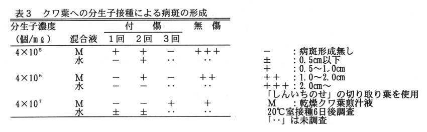 「しんいちのせ」の切り取り葉に、洗浄した分生子懸濁液を接種したところ、懸濁液とMを等量ずつ混合したもので発病率は100%と高く、水と混合したものは17.2%と低かった(分生子濃度4×10