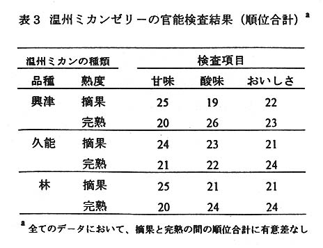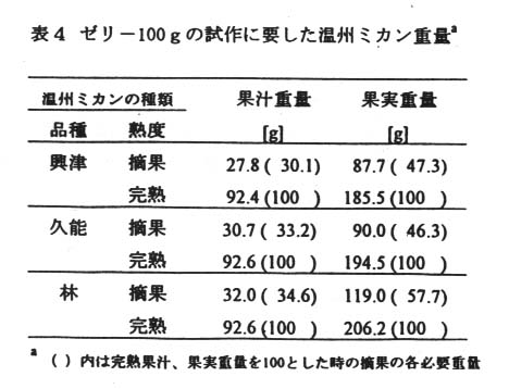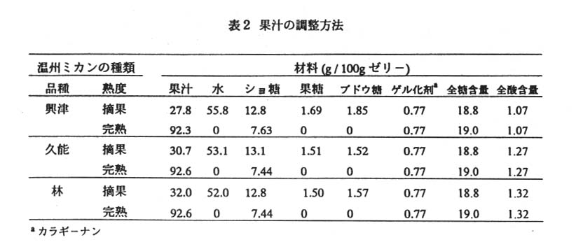 摘果ミカンは高い酸含量のために、ゼリー製造に要する使用果汁量を節約てき、製造効率の観点からも完熟ミカンに比べて有利であった(