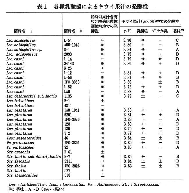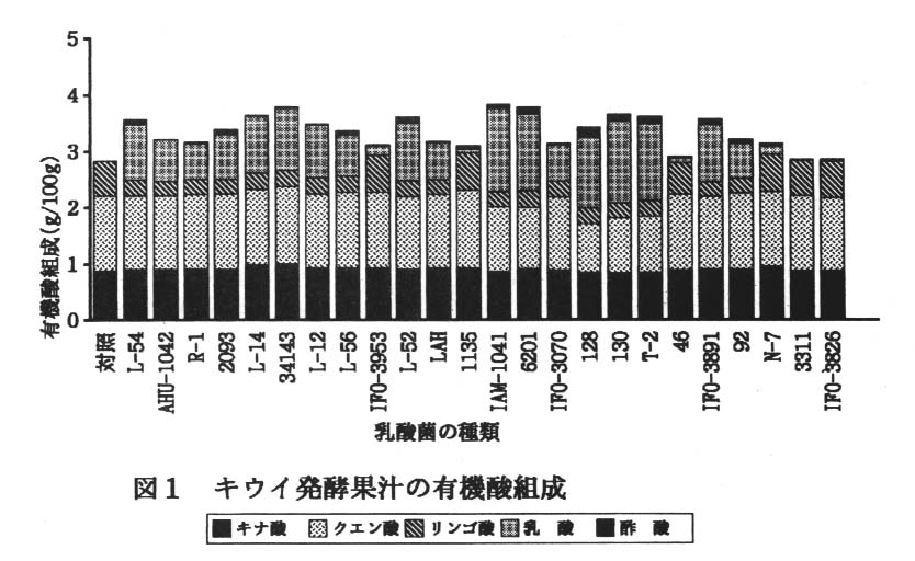 香味のすぐれてい5株菌の発酵果汁は、いずれもキウイの持つ,青臭みが消失し、まろやかな発効臭を呈しており、果汁中のリンゴ酸が資化されて乳酸が生成されるマロラクテイック発酵が起こっているものと推測された(