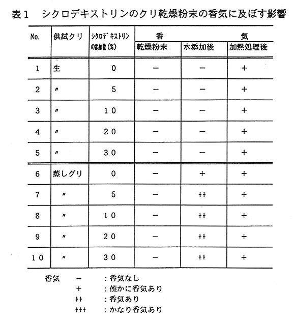 生果肉の乾燥粉末は、水を加えて加熱しても独特の風味はあるものの、シクロデキストリン添加の効果はなく、いずれの場合も蒸しグリのような香りは発現しなかった。一方、蒸した果肉から銅製した粉末は、ほとんど香りはなかったが、水を加えると蒸しグリの香りが発現しシクロデキストリン添加により増強された。しかし、これを加熟すると番りは弱くなった(