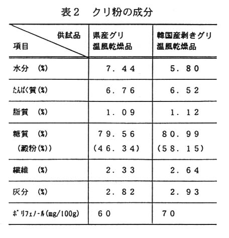乾燥した果肉を粉砕してクリ粉を得た。この乾燥品自体にクリの風味はなく、水を加えて加熱しても蒸しグリのような香気は発現しなかった。