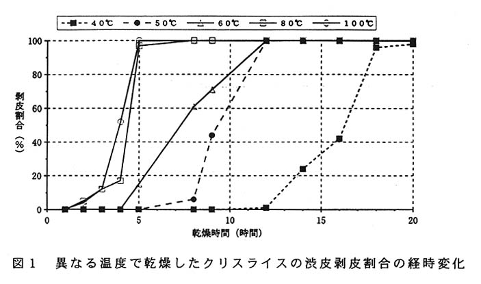 渋皮付の生果肉を3~5㎜幅にスライスして40℃以上で送風乾燥すると、渋皮と果肉が分離できた。乾燥温度が高いほど分離に要する時間は短くなったが、風味、色調等の点から50~60℃での乾燥が適当であった(