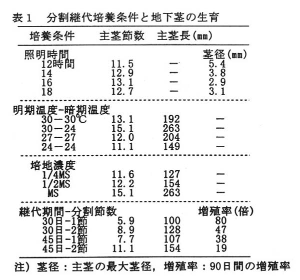 4)地下茎を2節で分割すると、30日毎の継代培養により90日間で47倍に増える。地下茎を1節で分割し、30日毎の継代培養では、増殖率は高いが生育が劣るため、分 割継代培養には不適である。(