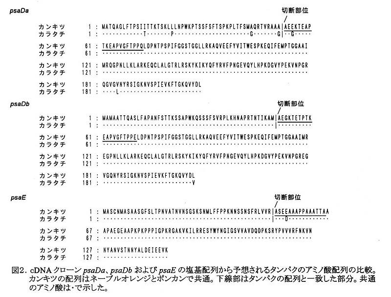 2種のカンキツ(ネーブルオレンジ、ポンカン)および近縁のカラタチの成葉cDNAライブラリから、PSI-DとPSI-Eサブユニットの遺伝子である