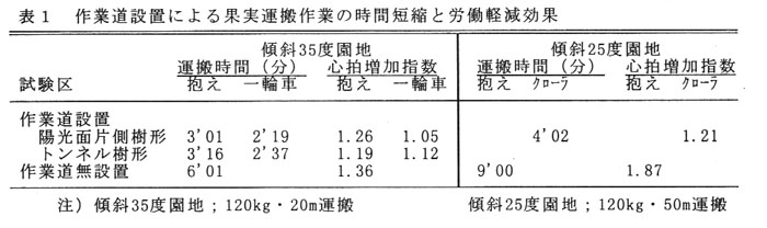 山根側に幅約0.8mの作業道を設置すると、運搬作業時間は設置前に比べ、抱え運搬で50%、一輪車利用で約60%短縮される。さらに小型クローラ式運搬車で約55%短縮され、労働強度が大幅に軽減される(