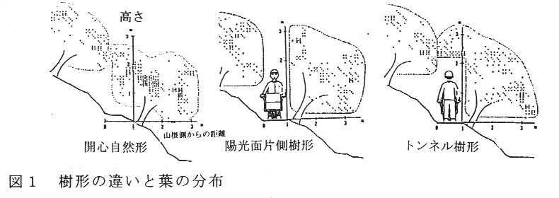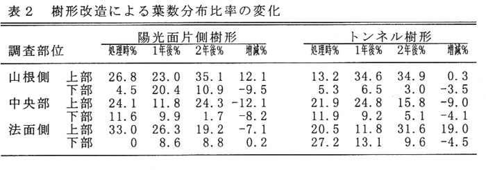 葉数は樹形改造2年後に陽光面片側樹形では勢除した山根側上部で増加し、その上段の法面下部も増加し、両方が重なり始める。トンネル樹形では樹冠上部の葉数が増加し、樹冠下部で減少する(