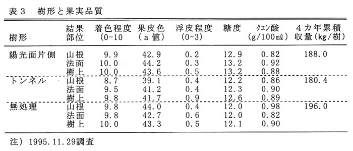 糖度は陽光面片側樹形でやや高くなる傾向であり、浮皮の発生がやや少なく、品質が向上する(