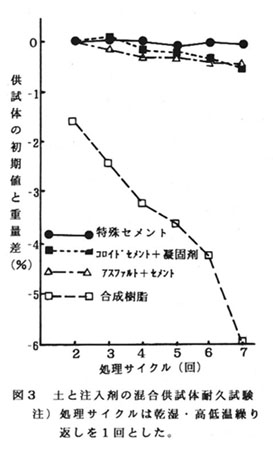 ため池堤体にグラウト施工を行う際には、堤体の漏水域より深い位置まで注入剤を注入して止水する。アスファルト系注入剤(標準配合:アスファルト82%、セメント7%、6%ベントナイト液6%、増量剤4%、添加剤0.6%)には、耐久性(