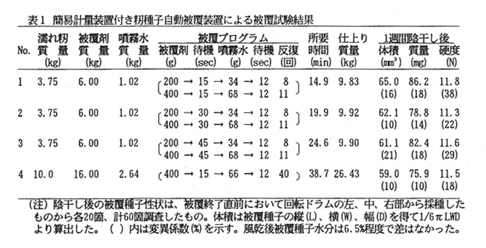 - 水稲の湛水直播においては、水稲種子の酸素供給剤(以下、被覆剤)による被覆作業には簡易な回転ドラムが利用されているが、被覆剤と水の供給は手作業であるため、均一な被覆種子が得られ難く、処理能力が低い。また、作業中に被覆剤が飛散し易いことや経験が必要であることなどから、直播栽培における普及上の間題点となっている。このため、既存の回転ドラムに被覆剤と水を自動で添加、噴霧する装置と利用法を開発する。