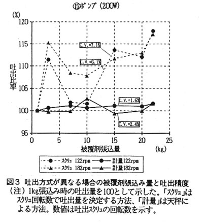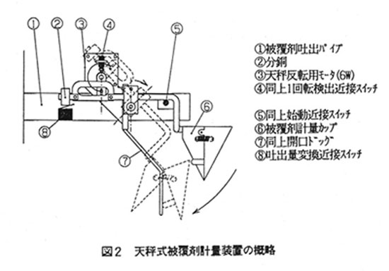 本装置は被覆剤タンク計量吐出部、水タンク計量噴霧部、洗浄用温水タンク噴射部、被覆ドラム部、制御部からなる。被覆剤タンク(被覆剤は24㎏投入可能)は底部に加変速吐出スクリュ、内部にアジテータ、外部に加振器を装備している(