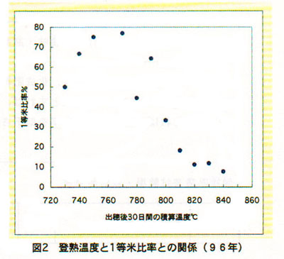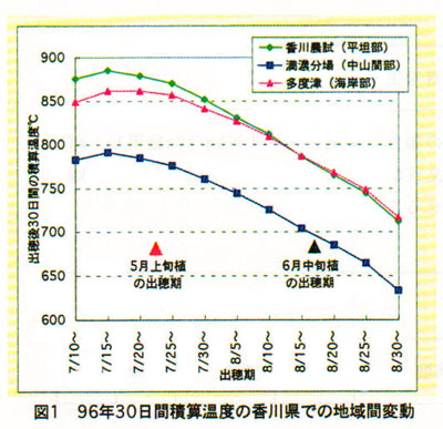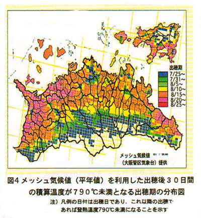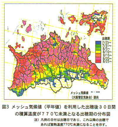 香川県のコシヒカリは幅広い作期において栽培されており、作期によって登熟期の気温が異なるため生理的に品質に違いが生じる。市場評価を高めるためには県下各地の気象に応じて登熟を適正にして品質向上を図る必要がある。そこで、香川県における気象の地域特性をメッシュ気候値を用いて解析する。特に品質低下要因が登熟期の高温障害であることから、登熟温度(出穂後30日間の積載温度)が品質に及ぼす影響を捉え、1等米生産のための最適な出穂期を把握する。