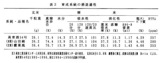 高知県における酒造好適米はほぼ全量が県外に依存しており、気象や価格変動により安定した需要量が確保できない状況にある。また、酒造業界においては地酒ブームや特定銘称酒の販売が緊調であることより、一段と自県産来やその酒造適性を重視するようになり、「山田錦」並みの酒造適性を持ち、安定性の高い新品種開発への期待が強かった。