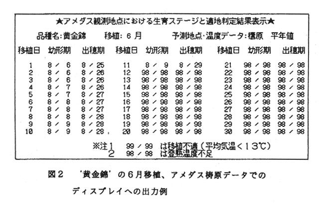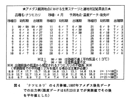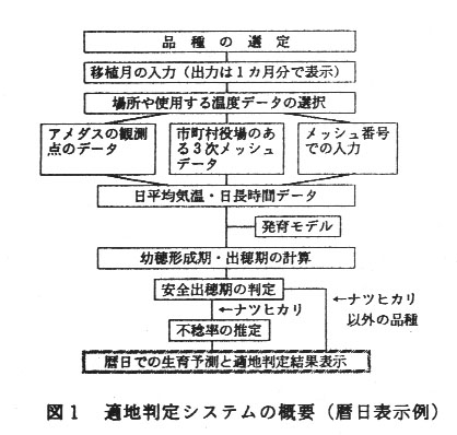 そのようななかで、水稲の新たな品種や作型を導入する場合に、該当地域の気象データを活用することによって生育の指標を示し、栽培上の障害となる登熟限界の目安や、極早生品種での障害型不稔を主とした不稔の発生を事前に知ることのできるシステムの開発が望まれていた。