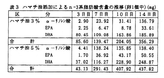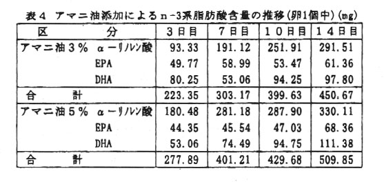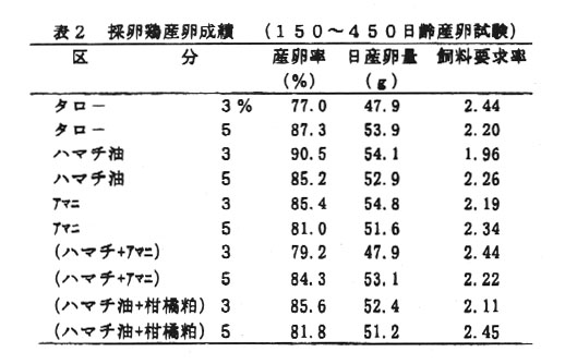 生産基盤が弱く、労働集約化の困難な中山間地域を活性化するためには、小規模ながら経営可能な高付加価値型の経営形熊を碓立する必要がある。一方健康会品に対する消費者の関心は高い。これに対応すべく、安価な勤・植物性未利用資源であるハマチ油及び柑橘粕やアマニ油脂肪酸カルシウム(FACa)(以下アマニ油と略称)を利月して、n-3系脂肪酸の豊富な鶏卵肉の生産技術を確立する。