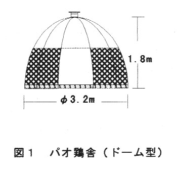 ドーム型鶏舎における飼育密度は、産卵期において3.8羽/㎡が有効である。また、このパオ鶏舎における産卵性は従来の木造鶏舎より優れている(