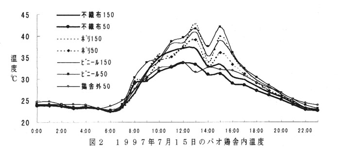 鶏舎内部温度について、夏期晴天時の日中にはビニールとポリエチレンは不織布に比べ2~10℃高く、鶏舎として使用するには遮光ネットなどの併用が必要である。(