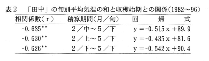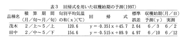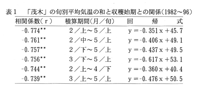 びわは、香川県の特産果樹として広く栽培がなされ、九州産地からの出荷がほぼ終了する6月以降に京阪神市場を中心に出荷されている。県内においては、普通種の「茂木」と晩生種の「田中」が主要品種として栽培されているため、出荷期間も長く、6月の京阪神市場における市場占有率は、60~70%と極めて高くなっている。しかし、いずれの品種とも出荷時期の年次変動が大きく、計画出荷による有利販売のためには、収穫始期の予測技術の開発が望まれている。そこで、旬別平均気温に着目し、収穫始期の予測を試みる。