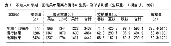 着葉数1,000程度の7年生「不知火」の場合、6月の早期一回摘果による摘果重量は177gに過ぎないのに、6月下旬と8月上旬の慣行摘果及び8月上旬と9月の後期摘果ではそれぞれ1,286g、2,424gに達する。したがって早期一回摘果は、梅雨から夏期の樹体への着果負担を大きく軽減する(