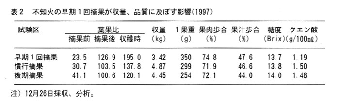 早期一回摘果によって収量は慣行摘果に比べて30%、後期摘果に比べて23%低下するが、果実重量はそれぞれ50g、100gも増加し、大果の生産量と正品率には差異がない。しかも果皮よりも果肉の生長が促進され、果汁歩合も高まる。さらにクエン酸は早期摘果区が0.3%低く、12月下旬には1.2%以下に低下するなど、品質向上効果が大きい(