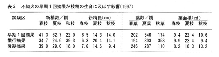 樹体の生長については、早期摘果によって慣行摘果や後期摘果に比べて細根が4~5倍増加し、また夏枝の発生も2倍以上増える。発生した夏枝は春枝に比較し2倍以上長く、葉面積も2倍以上広く、着花過多樹の樹勢回復にも効果が大きい(