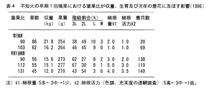 早期摘果の葉果比は、夏枝の生育と細根発生童及び収量がらみて100~120が適正である(