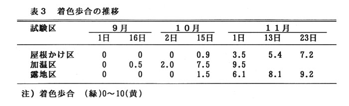 被覆処理により果皮は滑らかとなるか、着色は秋季の日中の高温により明らかに遅れる(