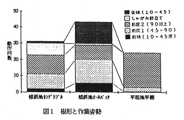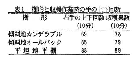 収穫作業姿勢は、カンデラブル樹形がオールバック樹形に比べて後傾姿勢が少なく、収穫作業動作回数も少ない。平棚に比べて前屈(90度以上)が少ないが、しゃがみ膝立て姿勢は多い(